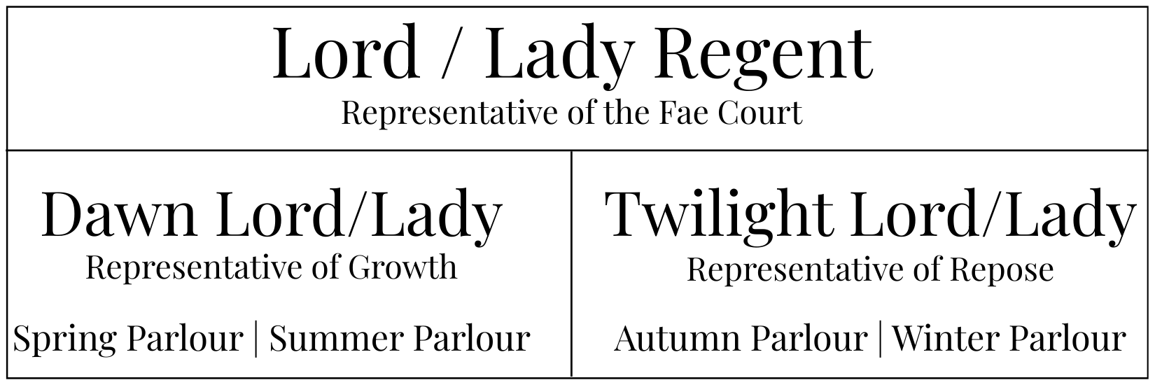 In Eclipse Ridge, every Fae has a voice in the Court. When the population is low, Lords and Ladies of the Parlours are welcome to speak in Court gatherings; while in times of higher populations, the Parlours may be invited to speak in Growth / Repose gatherings beforehand, then have their needs presented by their Representatives at the larger Court.