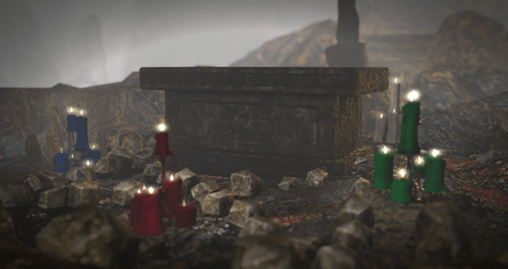 A single black candle at the center of the circle, anointed with oil infused with wormwood, myrrh, and poppy seeds. This candle acts as the bridge for the Vocatis to anchor to the world.